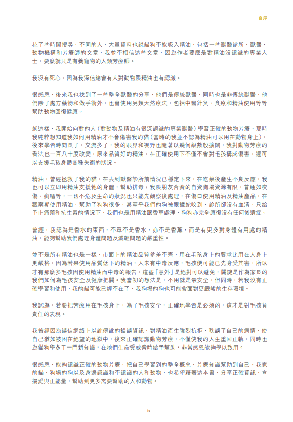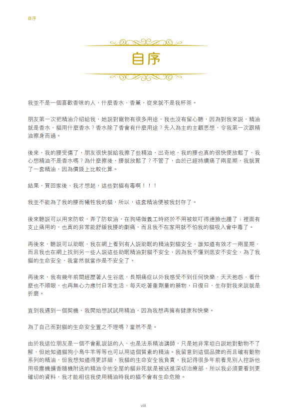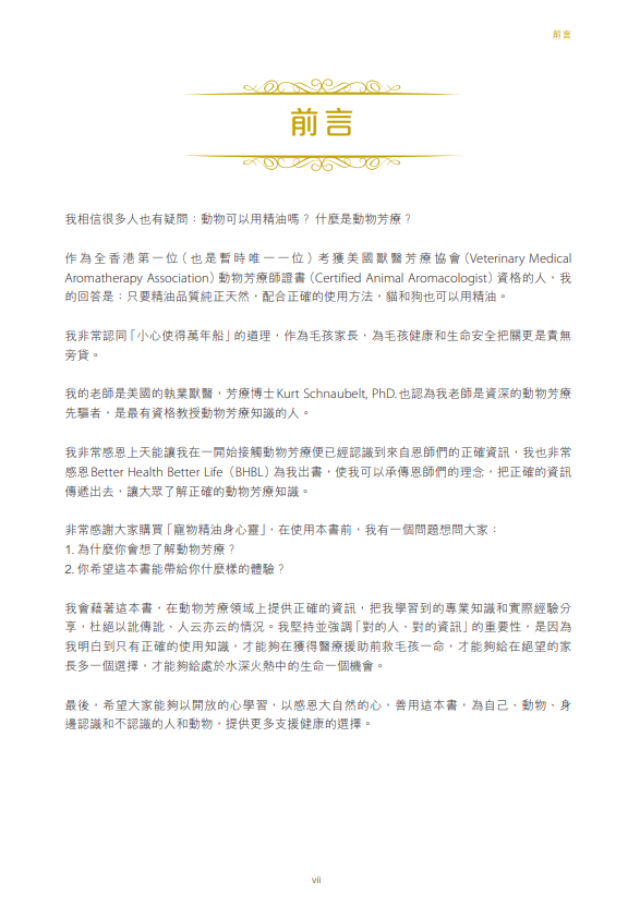 BHBL 致力推廣法系精油,我們非常榮幸,邀請到全港唯一考取由「美國獸醫芳療協會」 (Veterinary Medical Aromatherapy Association) 頒發的「動物芳療師證書」 (Certified Animal Aromacologist) 資格的 Silvia TO 女士,編寫全港第一本法系芳療寵物書籍。書內分享了 Silvia 廿多年來,一部分照料寵物(主要是貓狗)的經驗,萬勿錯過!!