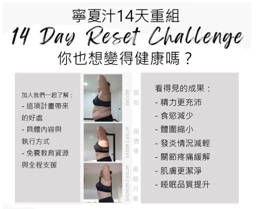 Reset 14days 一路做已覺個人精神咗好多。未開始前覺得條腸好塞,期間排便也算好咗!體重也較之前易控制咗!