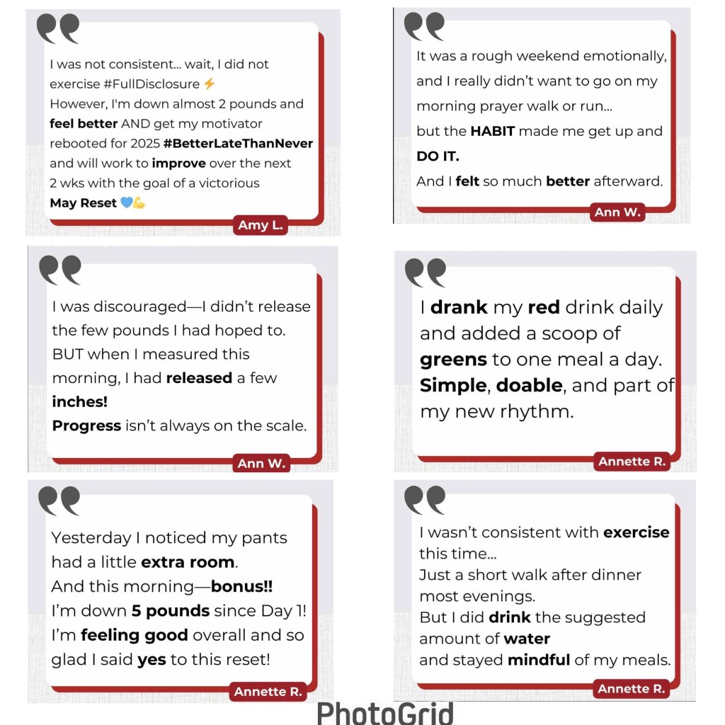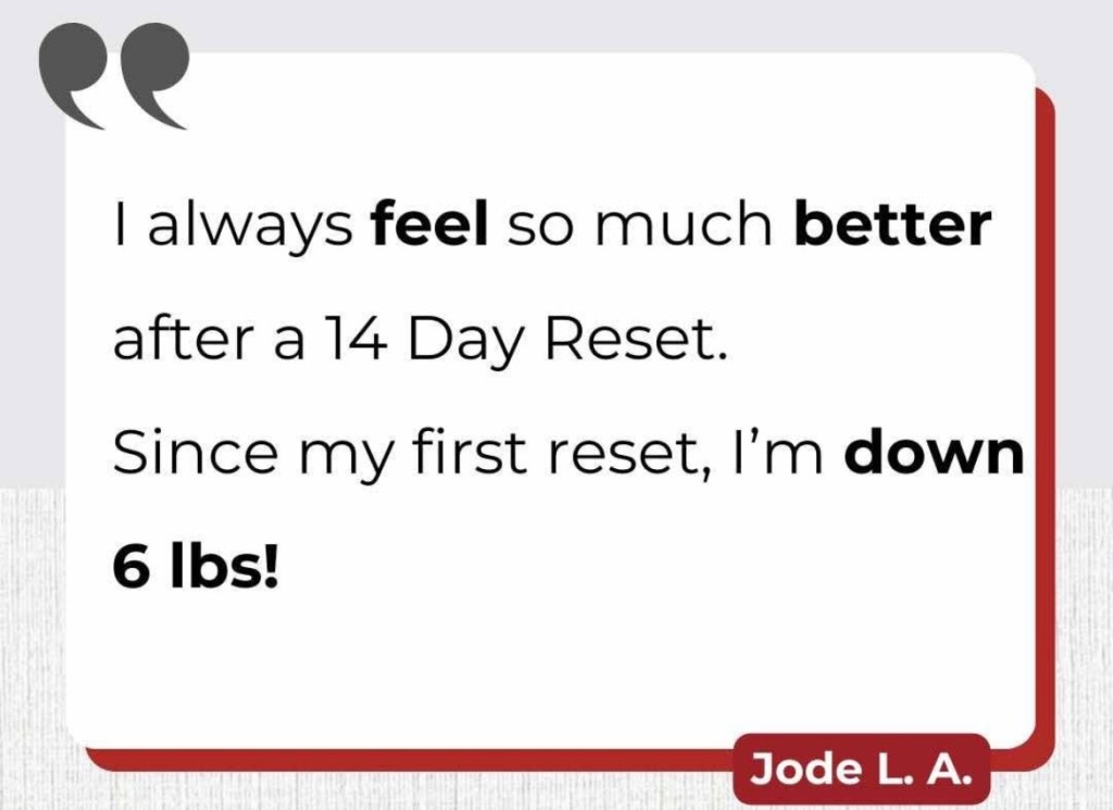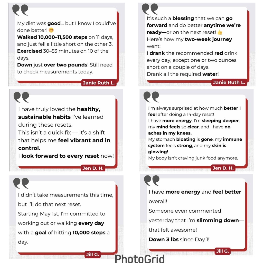 我很高興完成了這個挑戰!我迫不及待地想再進行一次!我只能於第一週100% 完成推薦要做的事情,然後第二週生活就因瑣碎事中斷了。即使如此,我還是減了 3.5 磅體重,身體減了 7 英寸!我感覺很棒!14天重組給我巨大的能量和多年來之中最好的睡眠!