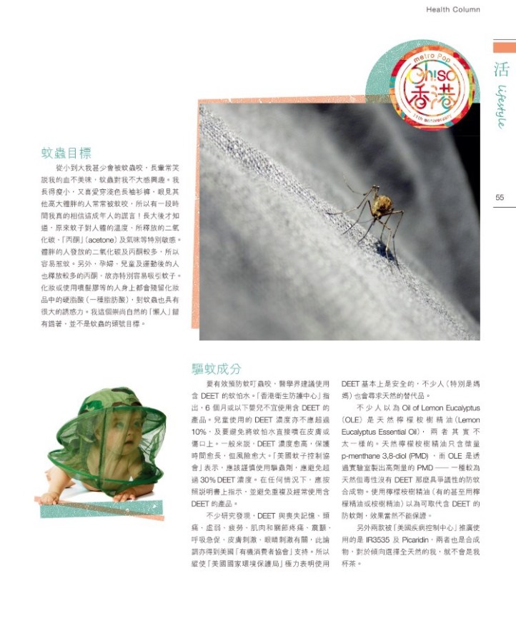 從小到大我甚少會被蚊蟲咬,長輩常笑說我的血不味美,蚊蟲對我不大感興趣。我長得瘦小,又喜愛穿淺色長袖衫褲,眼見其他高大體胖的人常常被蚊咬,所以有一段時間我真的相信這成年人的謊言!長大後才知道,原來蚊子對人體的溫度、所釋放的二氧化碳、「丙酮」(acetone)及氣味等特別敏感。體胖的人發放的二氧化碳及丙酮較多,所以容易惹蚊。另外,孕婦、兒童及運動後的人也釋放較多的丙酮,故亦特別容易吸引蚊子。化過妝或使用噴髮膠等的人身上都會殘留化妝品中的硬脂酸(一種脂肪酸),對蚊蟲也具有很大的誘惑力。我這個崇尚自然的「懶人」錯有錯著,並不是蚊蟲的頭號目標。