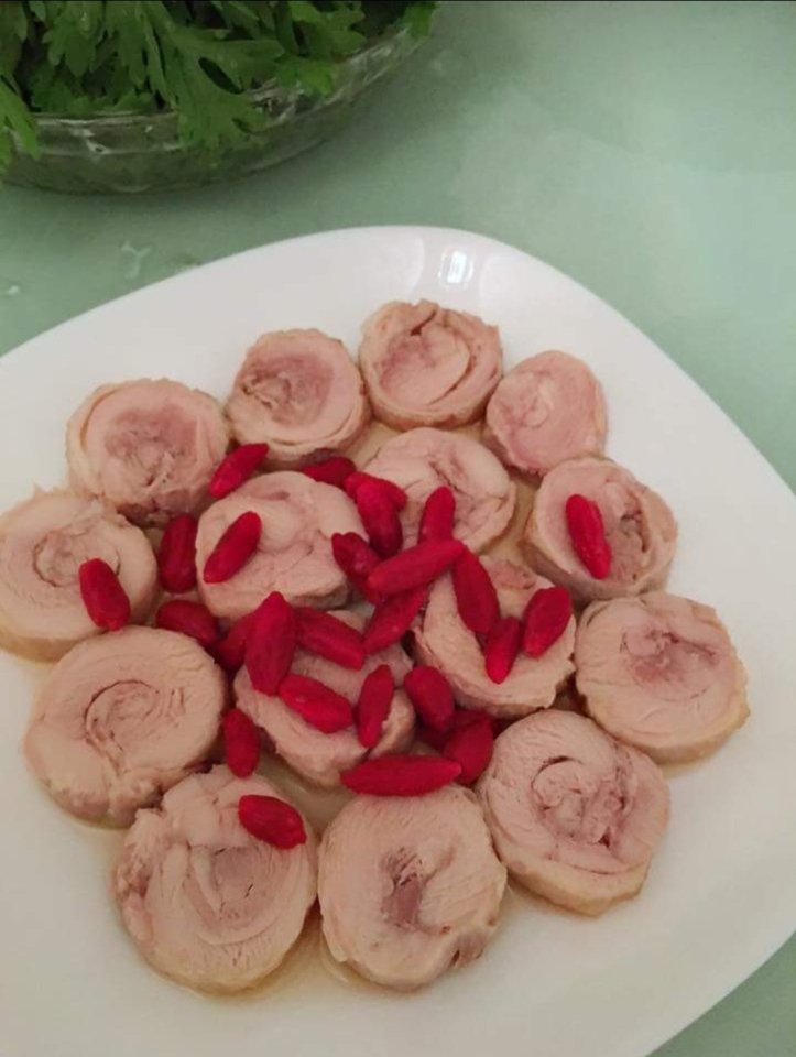 晚餐就有一味醉雞捲。做法十分簡單,只需買去骨雞腿,將肉切幾刀,灑上少許鹽及酒,用錫紙卷好,拿到鍋中用熱水浸熟。之後放冰水中浸數分鐘,然後放進紹興酒 + 杞子浸24 小時便可以了。對於經常進廚房的媽媽完全冇難度。