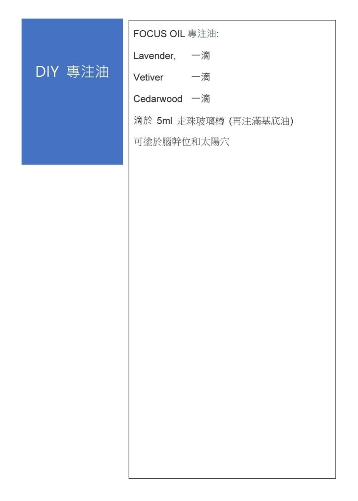 有一些精油可以給予孩子專注力提升。可以看看自己孩子是過份活躍還是不夠活躍而調配。專注力精油在往後部分給你參考。