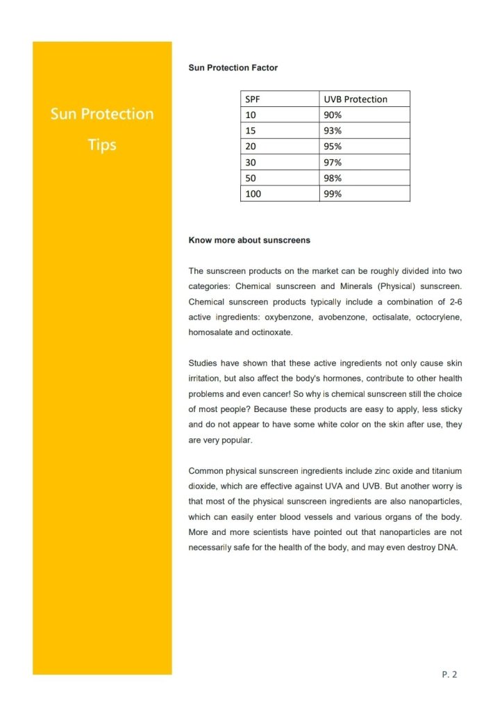 The most effective way to protect yourself from sun exposure is to wear long-sleeved clothes and trousers, sunglasses with UVA + UVB and sun hats (or umbrellas), and avoid prolonged outdoor activities on days with strong UV rays. In case you go to the beach or do water activities, you should use physical sunscreen products without-nanoparticles, and apply every two hours. Cover your skin with a towel (preferably with UVA + UVB protection) or put on your clothes when you are no longer in the water sports. Don’t forget to use some cooling and skin care products after the activity, such as aloe vera adding with Lavender, Helichrysum and Black Spruce essential oil.