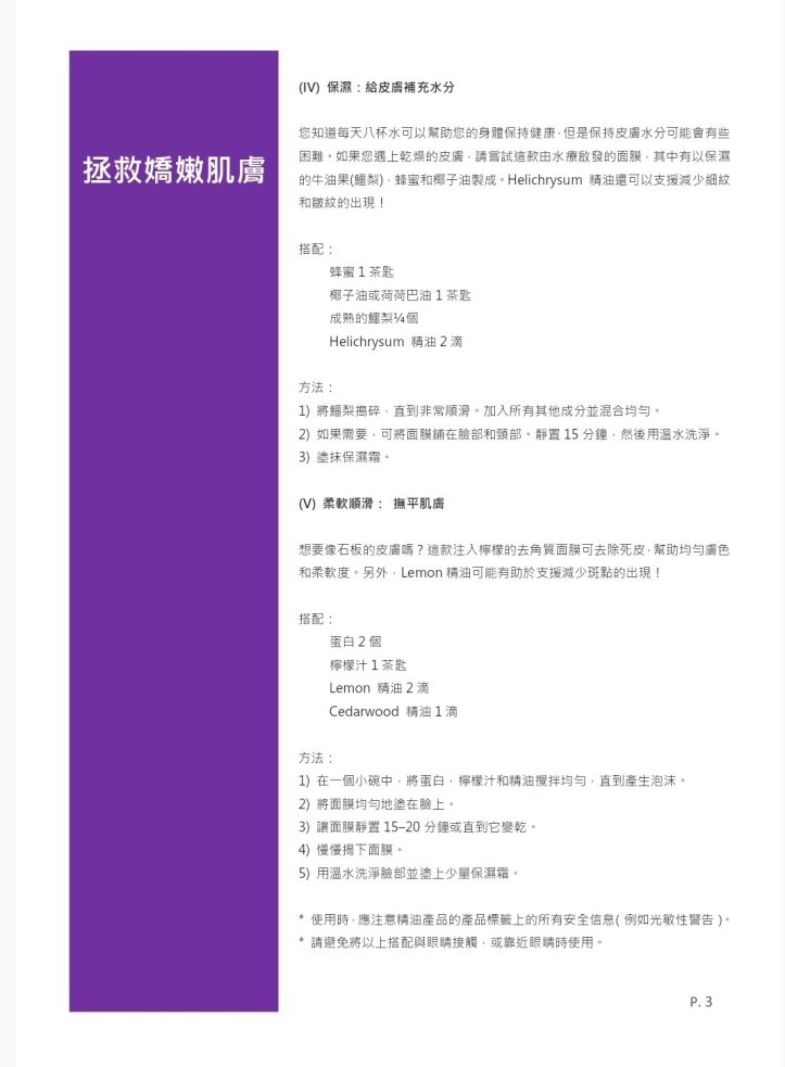 * 使用時,應注意精油產品的產品標籤上的所有安全信息(例如光敏性警告)。