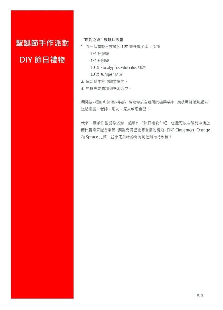 以下的簡單說明,讓您製作五份令人難忘的節日禮物:光滑手部磨砂膏,以撫平暴露在惡劣因素下的皮膚;冬季噴霧劑,以清新室內環境;保濕潤唇膏,保持嘴唇柔軟;令人垂涎的軟糖,在聚會上增添風味;繁忙地預備一天的豐富食物,聚會和娛樂之後,以“派對之後”輕鬆沐浴鹽為您注入活力!
