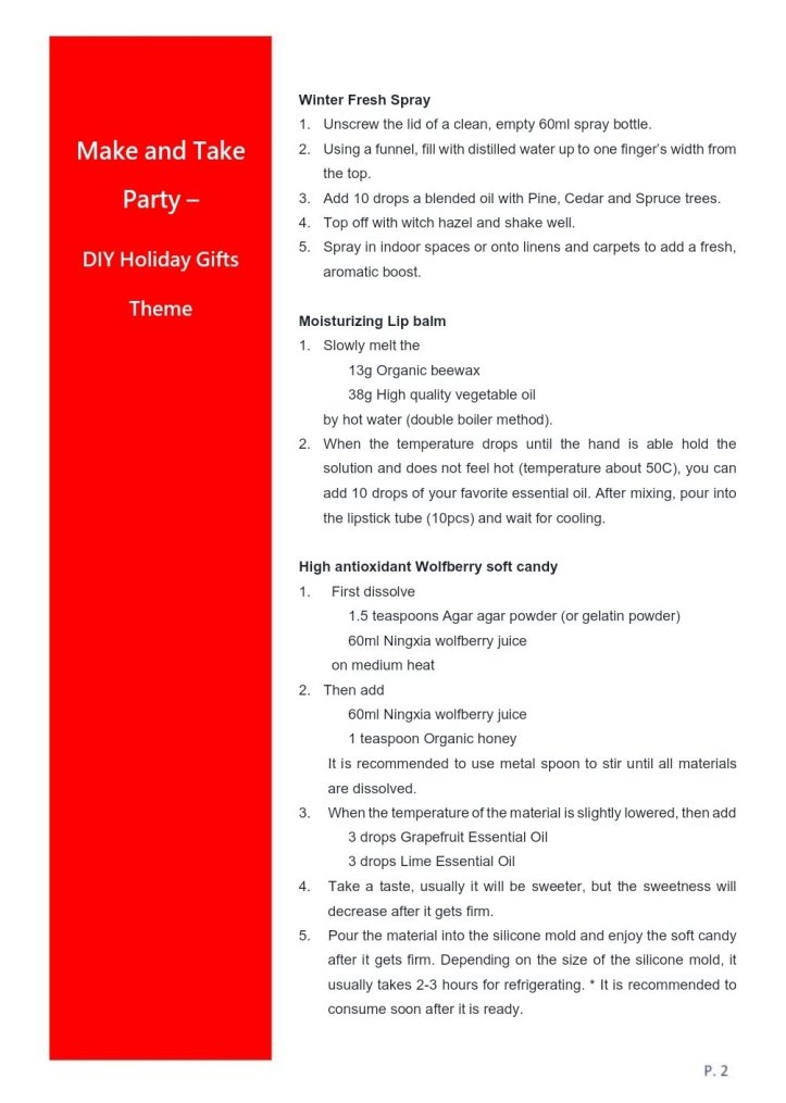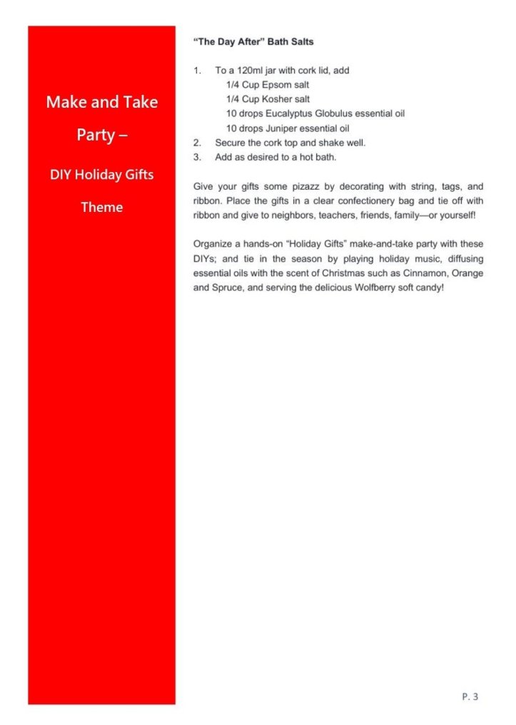 Organize a hands-on “Holiday Gifts” make-and-take party with these DIYs; and tie in the season by playing holiday music, diffusing essential oils with the scent of Christmas such as Cinnamon, Orange and Spruce, and serving the delicious Wolfberry soft candy!
