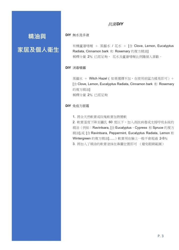 - 軟膏溫度下降至攝氏 60度以下,加入高抗病毒或支援呼吸系統的精油(例如:Ravintsara, [含Eucalyptus,Cypress 和Spruce的複方精油],或 [含Ravintsara, Peppermint, Eucalyptus Radiata, Lemon和 Wintergreen的複方精油]……)軟膏用在臉上一般不會超過 2-5%