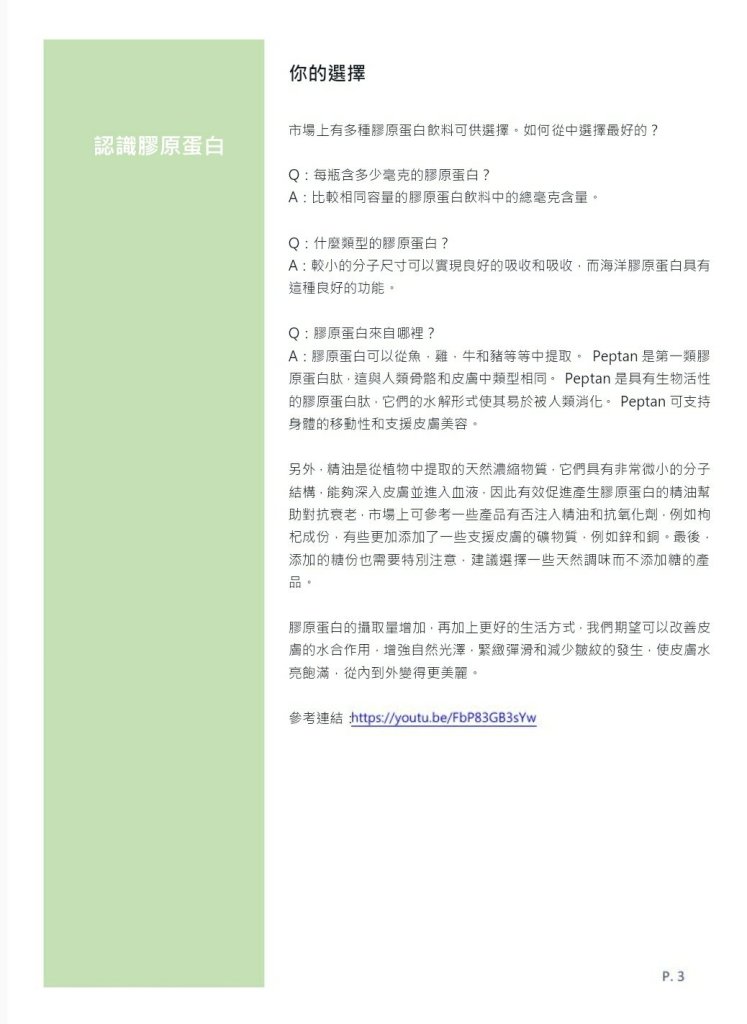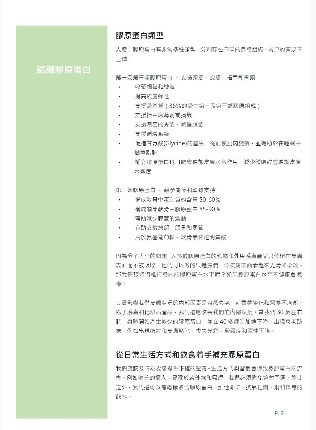 膠原蛋白的攝取量增加,再加上更好的生活方式,我們期望可以改善皮膚的水合作用,增強自然光澤,緊緻彈滑和減少皺紋的發生,使皮膚水亮飽滿,從內到外變得更美麗。