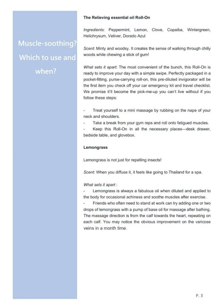 – Friends who often need to stand at work can try adding one or two drops of lemongrass with a pump of base oil for massage after bathing. The massage direction is from the calf towards the heart, repeating on each calf. You may notice the obvious improvement on the varicose veins in a month time.