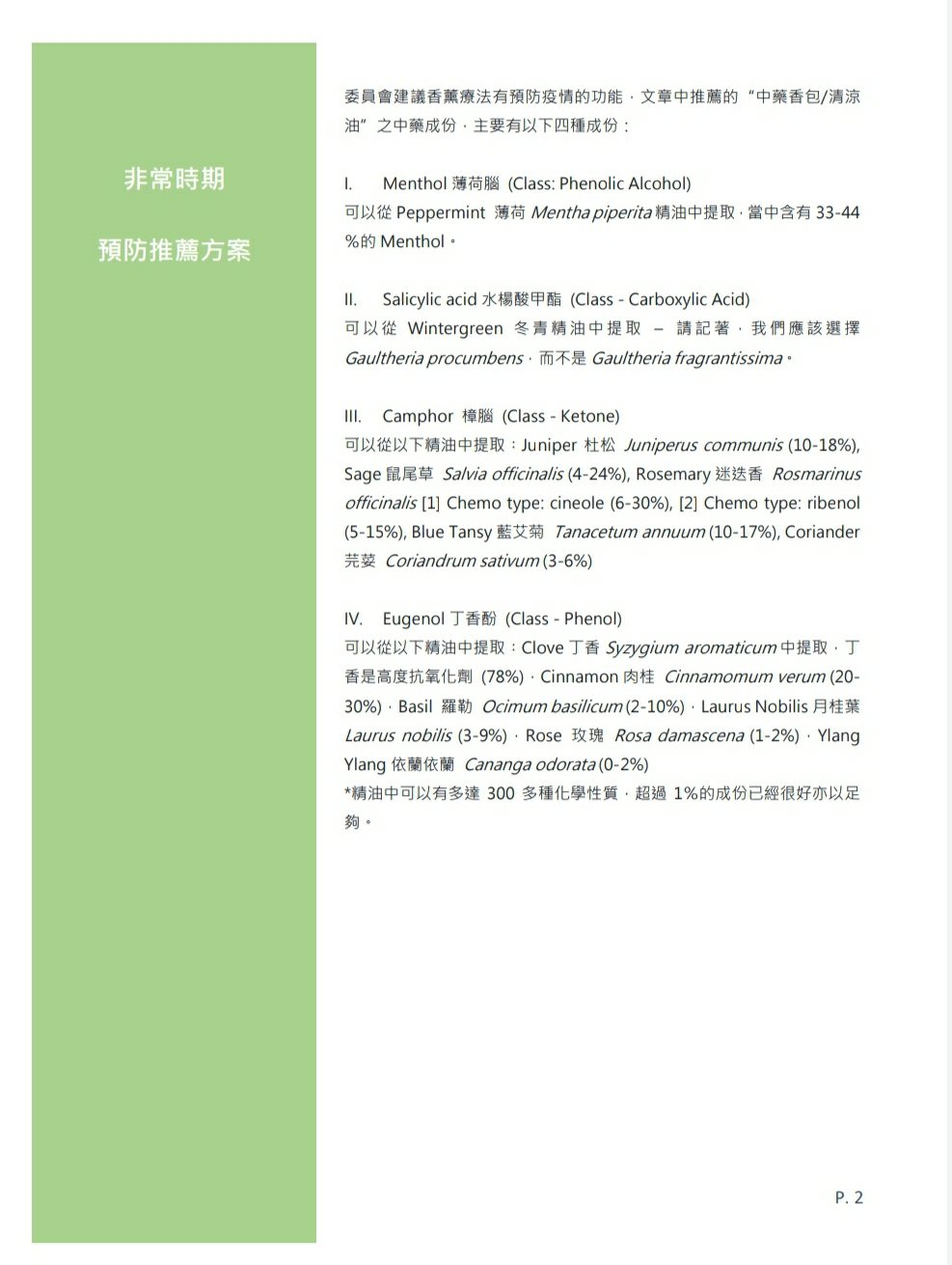 委員會建議香薰療法有預防疫情的功能,文章中推薦的“中藥香包/清涼油”之中藥成份,主要有以下四種成份: