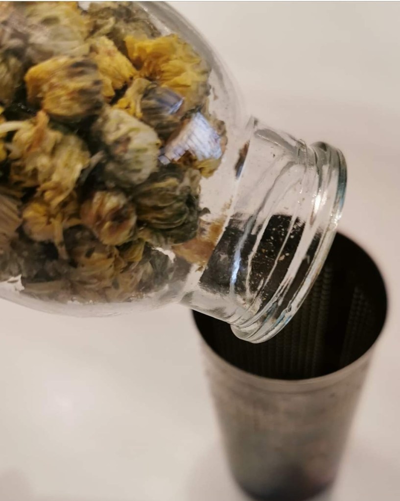菊花卡在瓶頸,無論多用力都倒不出來。 反而 放下瓶子搖一搖,再試, 菊花馬上倒出來。