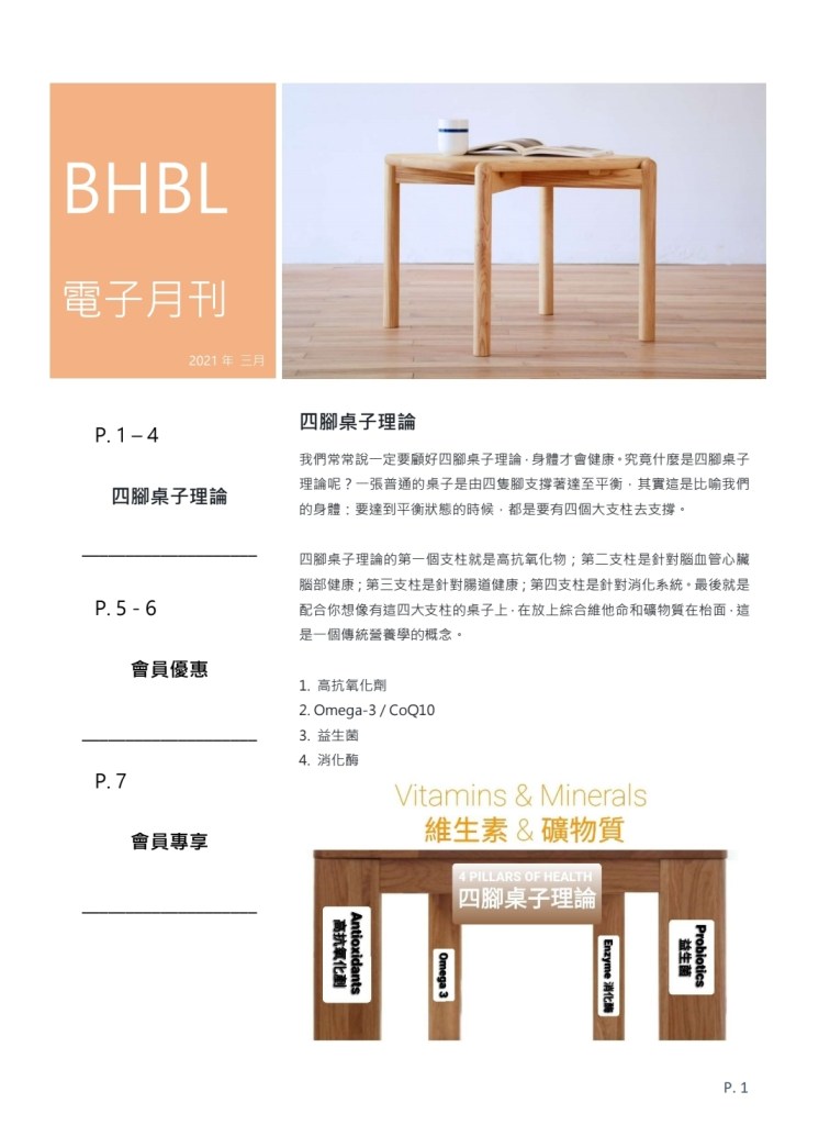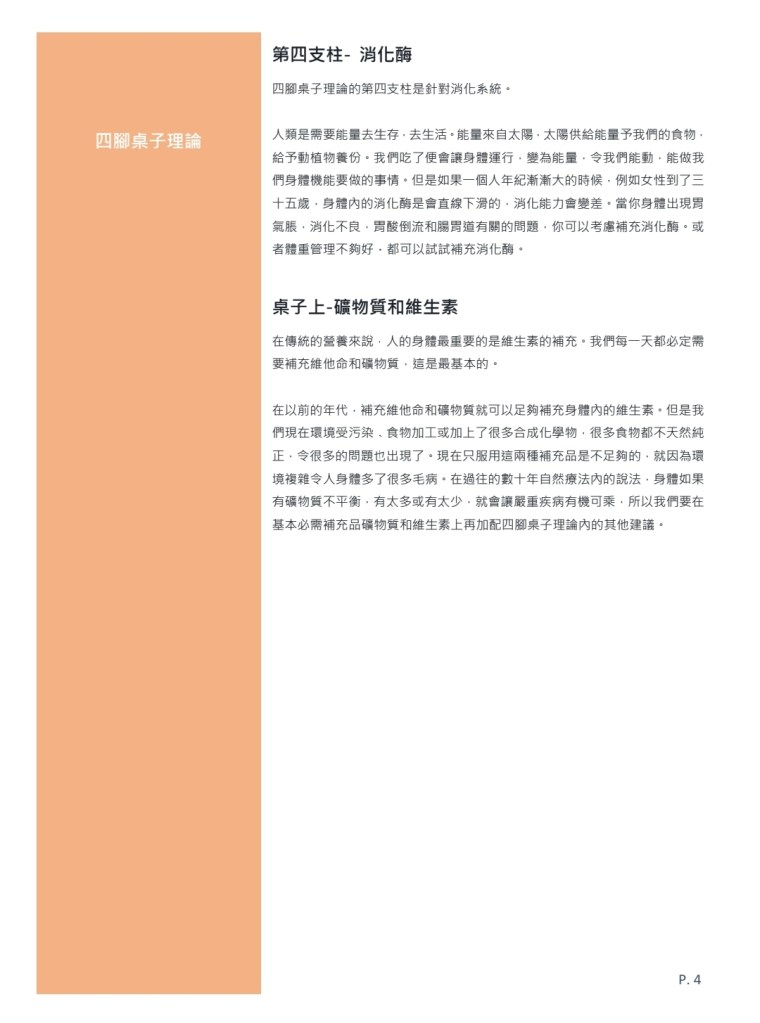 四腳桌子理論的第一個支柱就是高抗氧化物;第二支柱是針對腦血管心臟腦部健康;第三支柱是針對腸道健康;第四支柱是針對消化系統。最後就是配合你想像有這四大支柱的桌子上,在放上綜合維他命和礦物質在枱面,這是一個傳統營養學的概念。