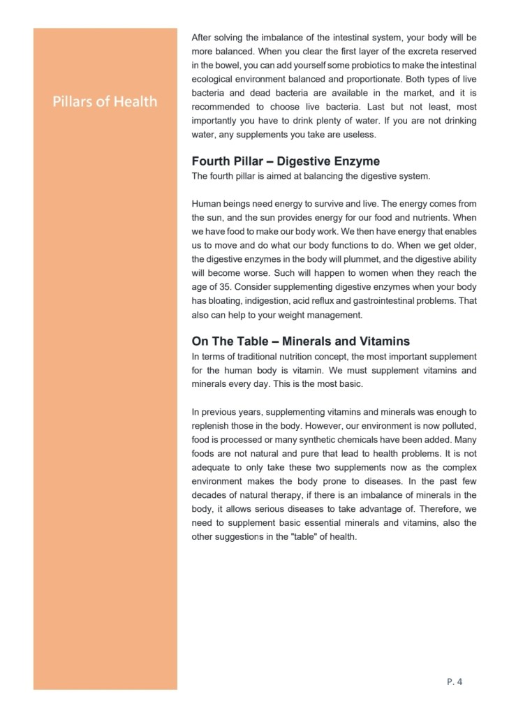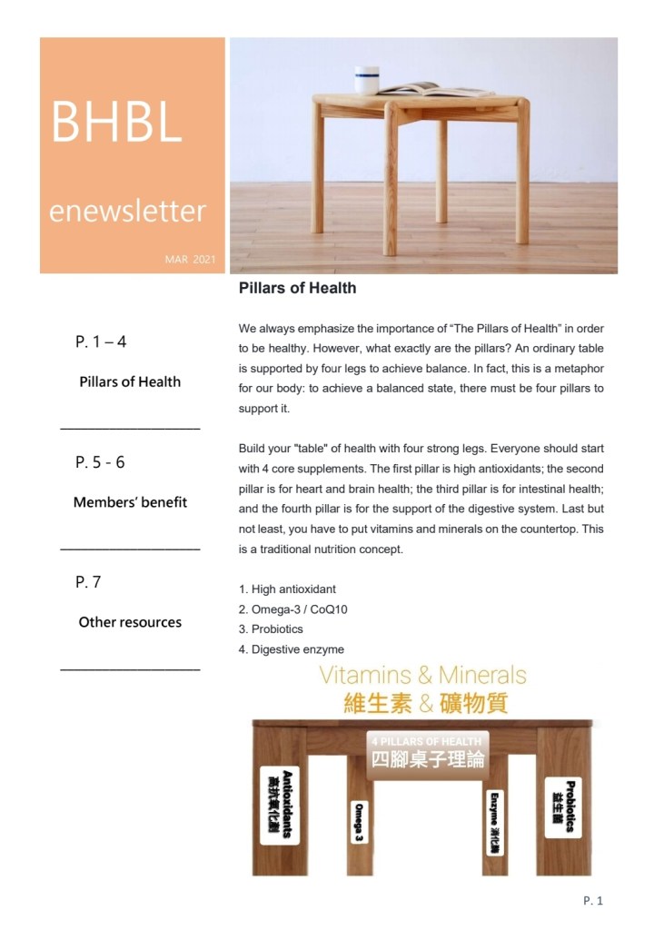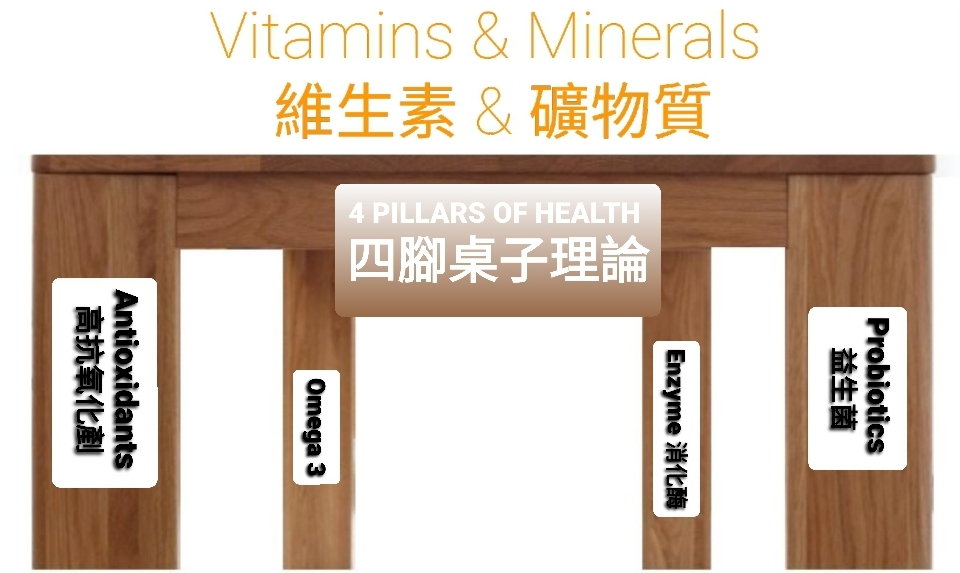 We always emphasize the importance of “The Pillars of Health” in order to be healthy. However, what exactly are the pillars? An ordinary table is supported by four legs to achieve balance. In fact, this is a metaphor for our body: to achieve a balanced state, there must be four pillars to support it.