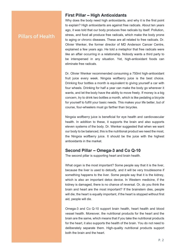 Ningxia wolfberry juice is beneficial for eye health and cardiovascular health. In addition to these, it supports the brain and also supports eleven systems of the body. Dr. Wenker suggested that when we want our body to be balanced, this is the nutritional product we need the most, the Ningxia wolfberry juice. It should be the juice with the highest antioxidants in the market.