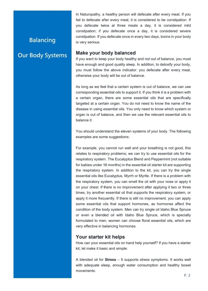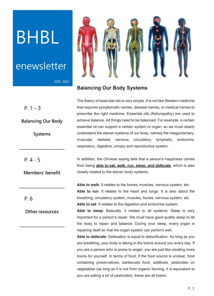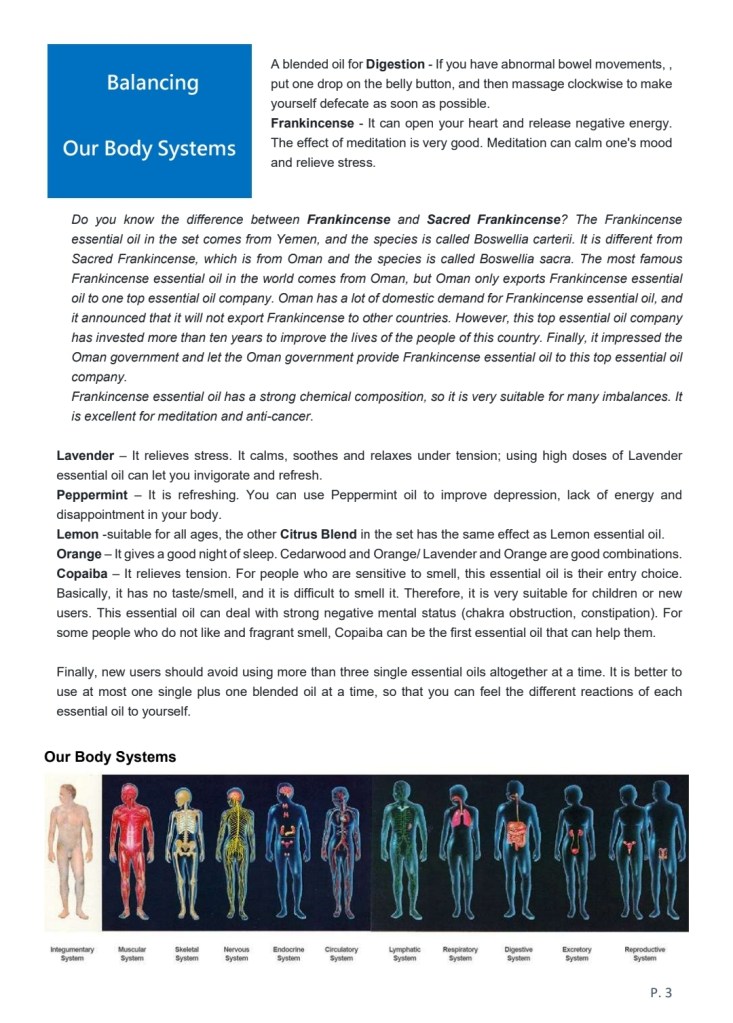 The theory of essential oils is very simple. It is not like Western medicine that requires symptomatic names, disease names, or medical names to prescribe the right medicine. Essential oils (Naturopathy) are used to achieve balance. All things need to be balanced. For example, a certain essential oil can support a certain system or organ, so we must clearly understand the eleven systems of our body, namely the integumentary, muscular, skeletal, nervous, circulatory, lymphatic, endocrine, respiratory, digestive, urinary and reproductive system.