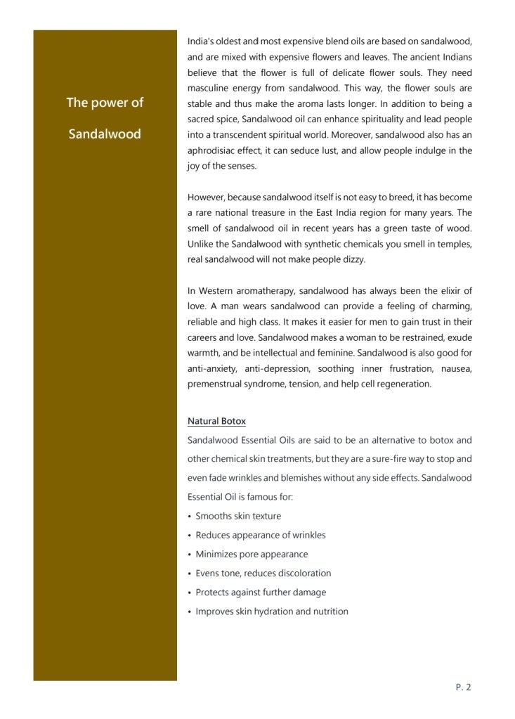 In Western aromatherapy, sandalwood has always been the elixir of love. A man wears sandalwood can provide a feeling of charming, reliable and high class. It makes it easier for men to gain trust in their careers and love. Sandalwood makes a woman to be restrained, exude warmth, and be intellectual and feminine. Sandalwood is also good for anti-anxiety, anti-depression, soothing inner frustration, nausea, premenstrual syndrome, tension, and help cell regeneration.