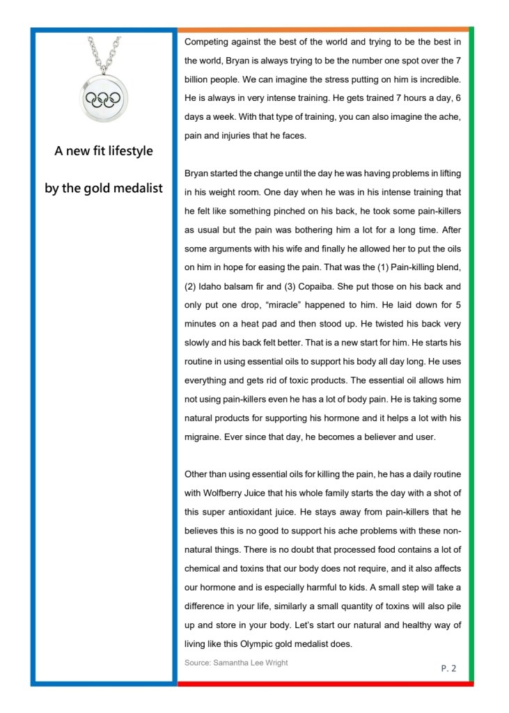 Bryan started the change until the day he was having problems in lifting in his weight room. One day when he was in his intense training that he felt like something pinched on his back, he took some pain-killers as usual but the pain was bothering him a lot for a long time. After some arguments with his wife and finally he allowed her to put the oils on him in hope for easing the pain. That was the (1) Pain-killing blend, (2) Idaho balsam fir and (3) Copaiba. She put those on his back and only put one drop, “miracle” happened to him. He laid down for 5 minutes on a heat pad and then stood up. He twisted his back very slowly and his back felt better. That is a new start for him.