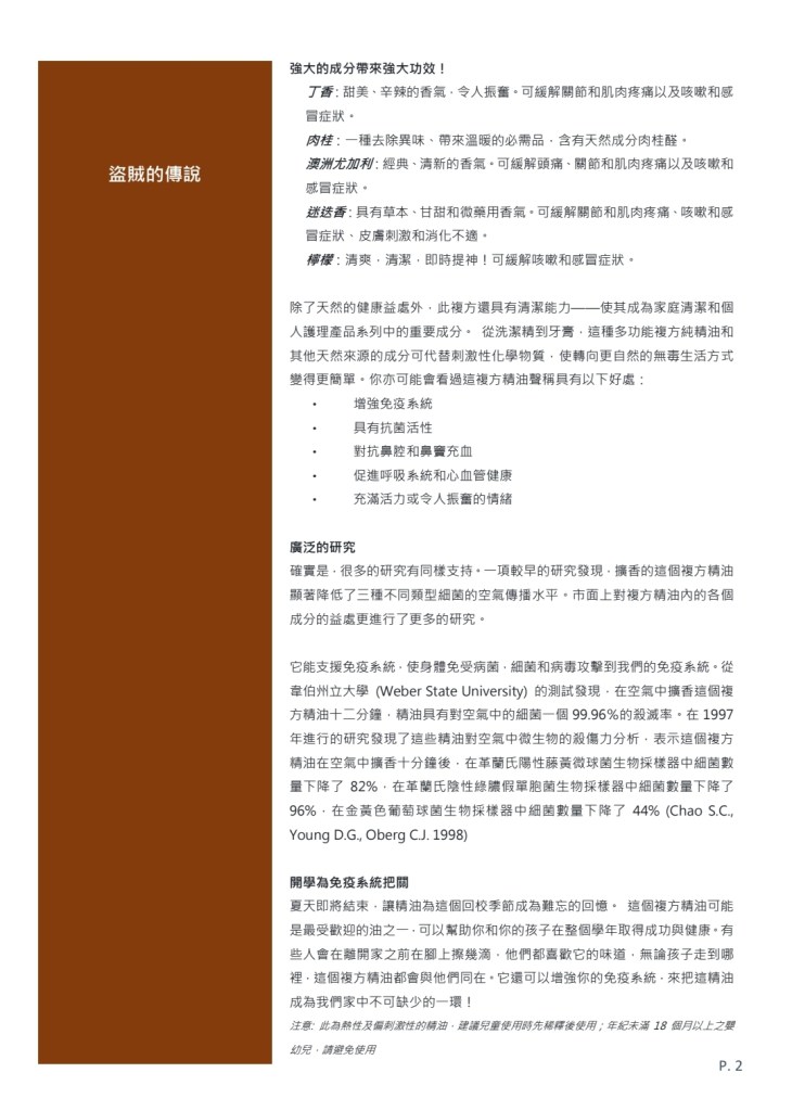 它能支援免疫系統,使身體免受病菌,細菌和病毒攻擊到我們的免疫系統。從韋伯州立大學 (Weber State University) 的測試發現,在空氣中擴香這個複方精油十二分鐘,精油具有對空氣中的細菌一個99.96%的殺滅率。在1997年進行的研究發現了這些精油對空氣中微生物的殺傷力分析,表示這個複方精油在空氣中擴香十分鐘後,在革蘭氏陽性藤黃微球菌生物採樣器中細菌數量下降了82%,在革蘭氏陰性綠膿假單胞菌生物採樣器中細菌數量下降了96%,在金黃色葡萄球菌生物採樣器中細菌數量下降了44% (Chao S.C., Young D.G., Oberg C.J. 1998)