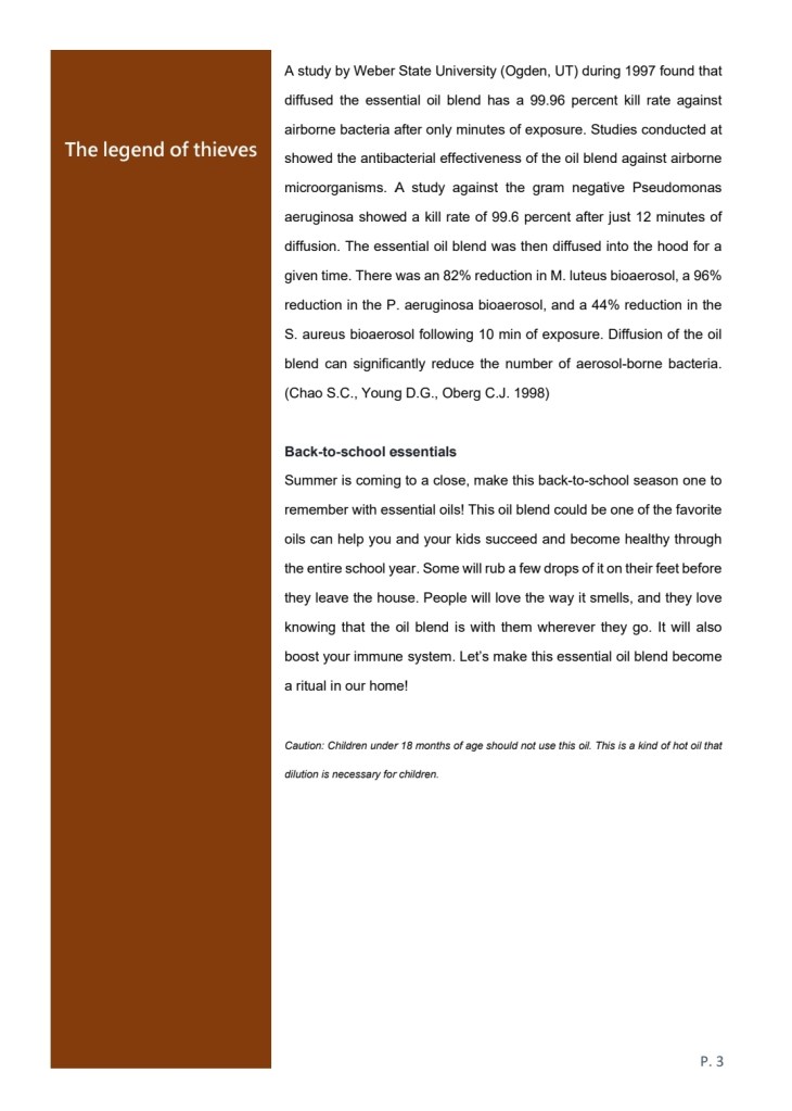 A study by Weber State University (Ogden, UT) during 1997 found that diffused the essential oil blend has a 99.96 percent kill rate against airborne bacteria after only minutes of exposure. Studies conducted at showed the antibacterial effectiveness of the oil blend against airborne microorganisms. A study against the gram negative Pseudomonas aeruginosa showed a kill rate of 99.6 percent after just 12 minutes of diffusion. The essential oil blend was then diffused into the hood for a given time. There was an 82% reduction in M. luteus bioaerosol, a 96% reduction in the P. aeruginosa bioaerosol, and a 44% reduction in the S. aureus bioaerosol following 10 min of exposure. Diffusion of the oil blend can significantly reduce the number of aerosol-borne bacteria. (Chao S.C., Young D.G., Oberg C.J. 1998)