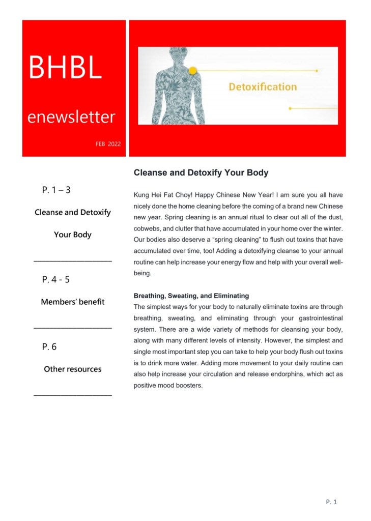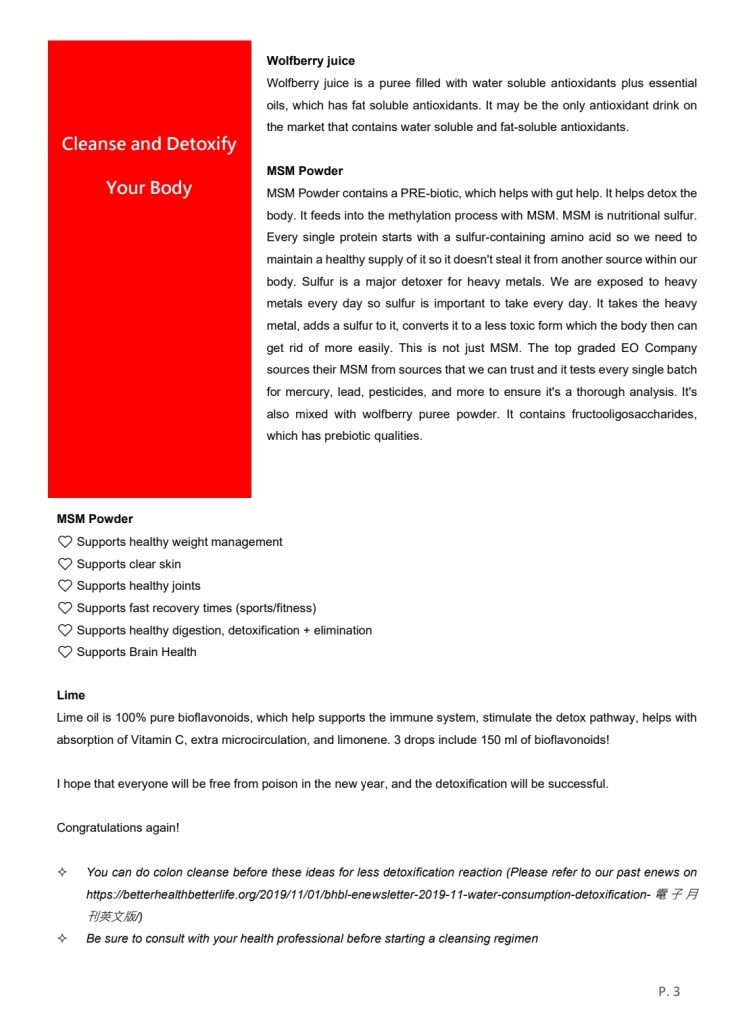 - You can do colon cleanse before these ideas for less detoxification reaction (Please refer to our past eNews on https://betterhealthbetterlife.org/2019/11/01/bhbl-enewsletter-2019-11-water-consumption-detoxification-電子月刊英文版/)