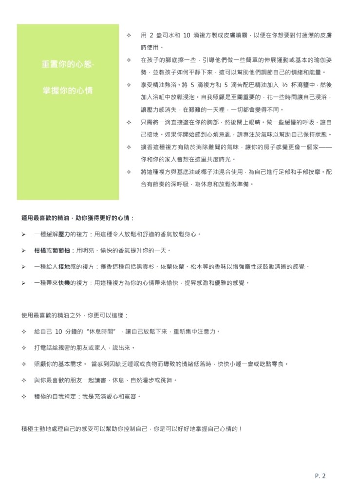 - 塗抹在手腕和頸部作香水,以產生即時的感官效果。