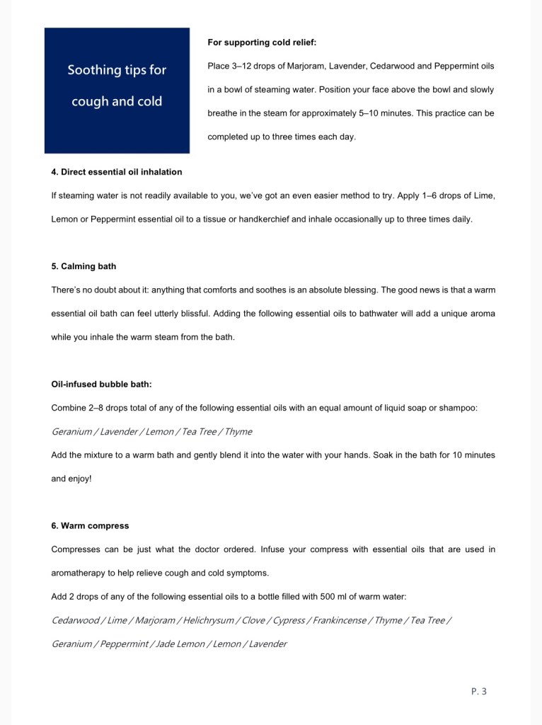 Place 3–12 drops of Marjoram, Lavender, Cedarwood and Peppermint oils in a bowl of steaming water. Position your face above the bowl and slowly breathe in the steam for approximately 5–10 minutes. This practice can be completed up to three times each day.