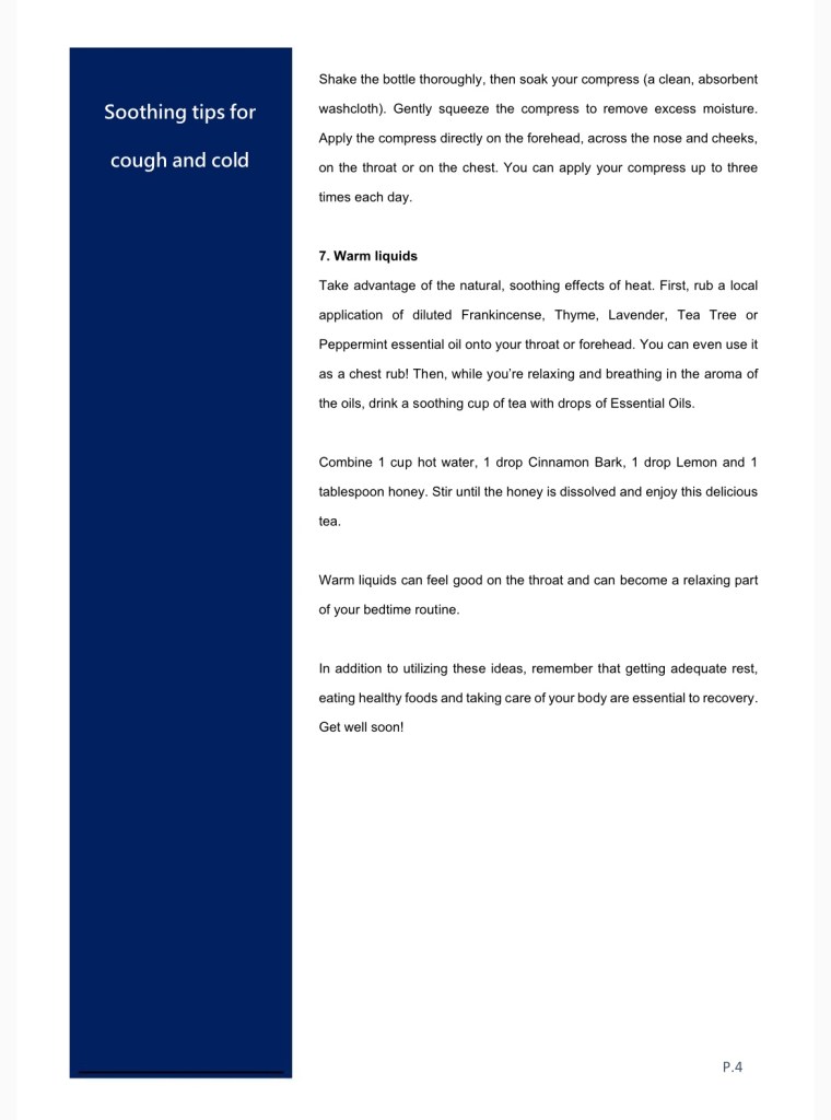 Take advantage of the natural, soothing effects of heat. First, rub a local application of diluted Frankincense, Thyme, Lavender, Tea Tree or Peppermint essential oil onto your throat or forehead. You can even use it as a chest rub! Then, while you’re relaxing and breathing in the aroma of the oils, drink a soothing cup of tea with drops of Essential Oils.