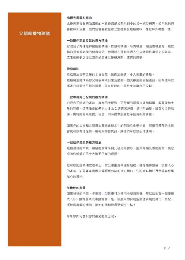 這種精油將成為你父親夜間或日常活動的一個受歡迎的支援產品,因為他可以擴香它以營造平靜的氛圍,並在忙碌的一天結束時讓自己放鬆。