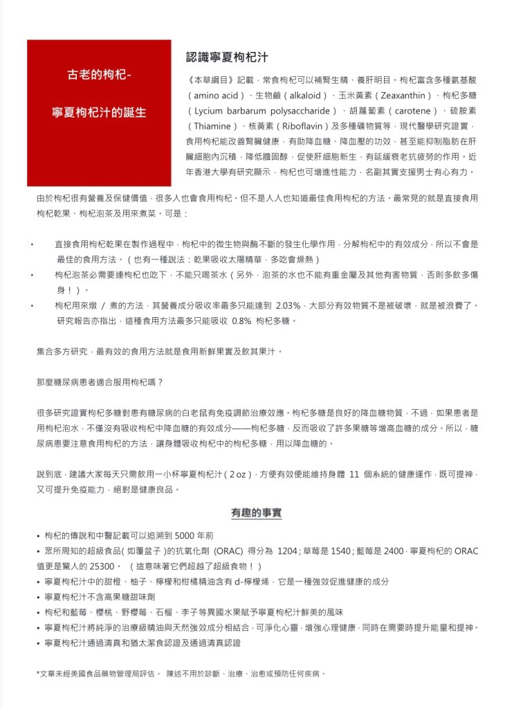 說到底,建議大家每天只需飲用一小杯寧夏枸杞汁(2 oz),方便有效便能維持身體 11 個系統的健康運作,既可提神,又可提升免疫能力,絕對是健康良品。