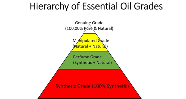 There are different grades of essential oils. I count four quality grades for essential oils from the highest quality (GENUINE Grade) to the lowest quality (SYNTHETIC Grade). I find it best to picture these Quality Grades as a triangle to represent the volume of these Grades sold in the market as “essential oils”.
