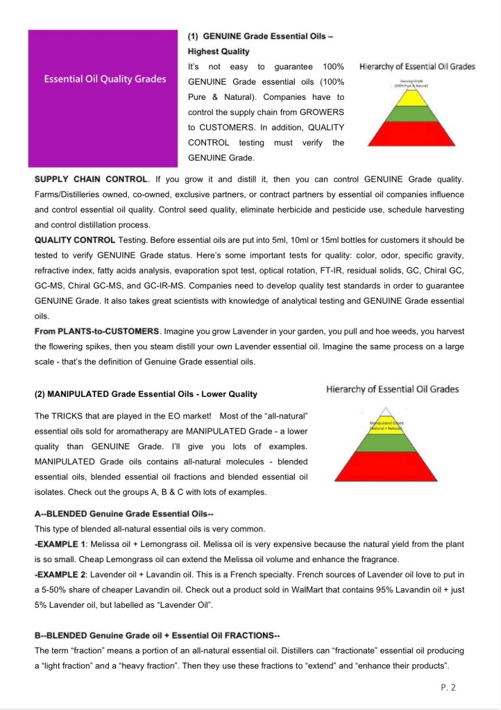 The TRICKS that are played in the EO market! Most of the “all-natural” essential oils sold for aromatherapy are MANIPULATED Grade – a lower quality than GENUINE Grade. I’ll give you lots of examples. MANIPULATED Grade oils contains all-natural molecules – blended essential oils, blended essential oil fractions and blended essential oil isolates. Check out the groups A, B & C with lots of examples.