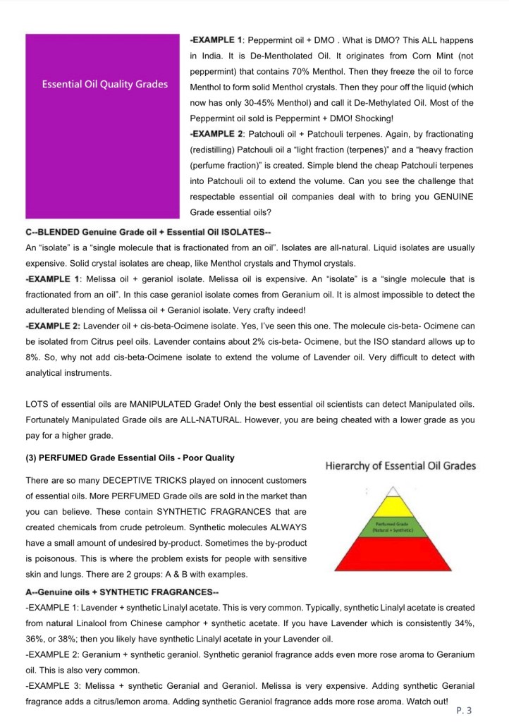 There are so many DECEPTIVE TRICKS played on innocent customers of essential oils. More PERFUMED Grade oils are sold in the market than you can believe. These contain SYNTHETIC FRAGRANCES that are created chemicals from crude petroleum. Synthetic molecules ALWAYS have a small amount of undesired by-product. Sometimes the by-product is poisonous. This is where the problem exists for people with sensitive skin and lungs. There are 2 groups: A & B with examples.