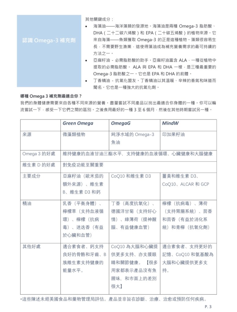 | 其他好處 | 適合素食者、鈣支持良好的骨骼和牙齒、B 族維生素支持健康的能量水平。 | CoQ10 為大腦和心臟提供更多支持、亦支援眼睛和關節健康。 【很多用家都表示產品沒有魚腥味,和市面上的差別很大】 | 適合素食者、支持更好的記憶、CoQ10 和氨基酸為大腦和心臟提供更多支持。 |