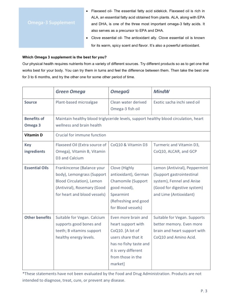 | Key ingredients | Flaxseed Oil (Extra source of Omega), Vitamin B, Vitamin D3 and Calcium | CoQ10 & Vitamin D3 | Turmeric and Vitamin D3, CoQ10, ALCAR, and GCP |