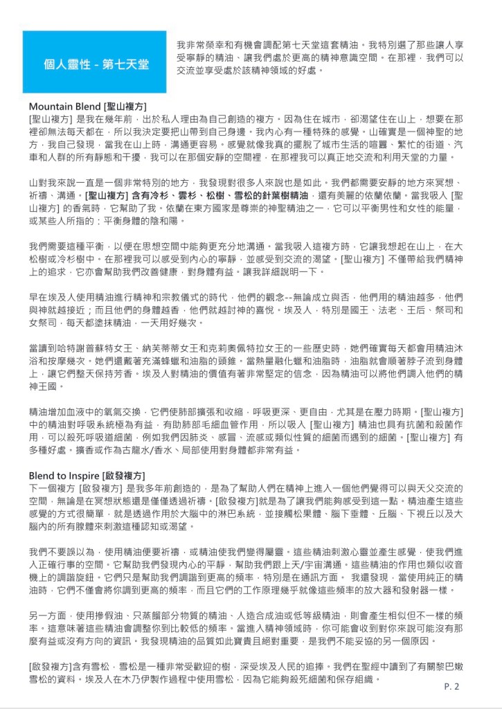 我非常榮幸和有機會調配第七天堂這套精油。我特別選了那些讓人享受寧靜的精油、讓我們處於更高的精神意識空間。在那裡,我們可以交流並享受處於該精神領域的好處。