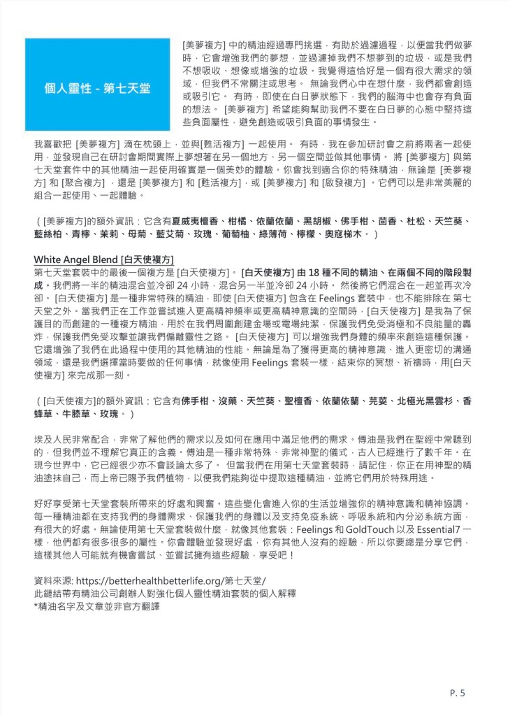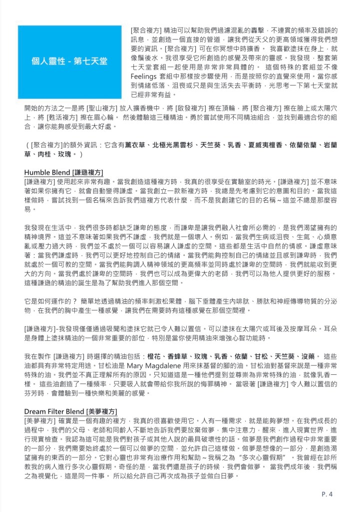 [聚合複方] 精油可以幫助我們過濾混亂的轟擊,不連貫的頻率及錯誤的訊息,並創造一個直接的管道,讓我們從天父的更高領域獲得我們想要的資訊。[聚合複方] 可在你冥想中時擴香。 我喜歡塗抹在身上,就像鬚後水。我很享受它所創造的感覺及帶來的靈感。我發現,整套第七天堂套組一起使用是非常非常具體的。 這個特殊的套組並不像 Feelings 套組中那樣按步驟使用,而是按照你的直覺來使用。當你感到情緒低落、沮喪或只是與生活失去平衡時,光思考一下第七天堂就已經非常有益。