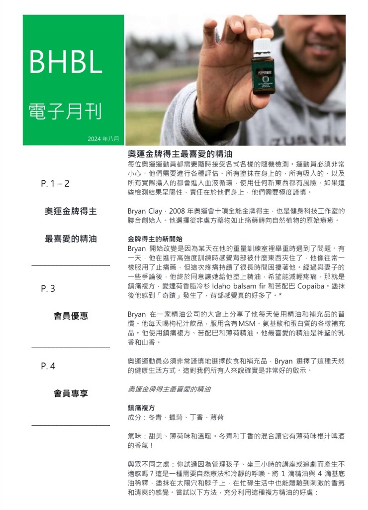 Bryan開始改變是因為某天在他的重量訓練室裡舉重時遇到了問題。有一天,他在進行高強度訓練時感覺背部被什麼東西夾住了,他像往常一樣服用了止痛藥,但這次疼痛持續了很長時間困擾著他。經過與妻子的一些爭論後,他終於同意讓她給他塗上精油,希望能減輕疼痛。那就是鎮痛複方,愛達荷香脂冷杉Idaho balsam fir和苦配巴Copaiba。塗抹後他感到「奇蹟」發生了,背部感覺真的好多了。*