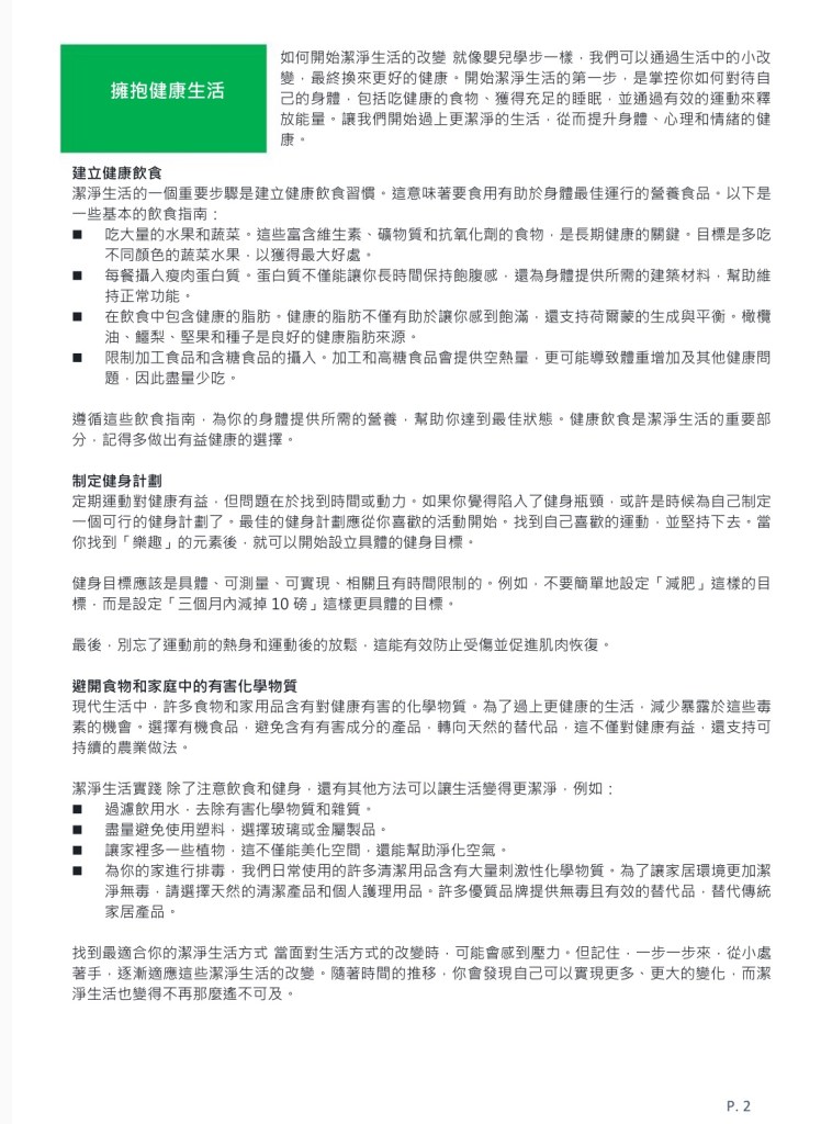 潔淨生活實踐 除了注意飲食和健身,還有其他方法可以讓生活變得更潔淨,例如: