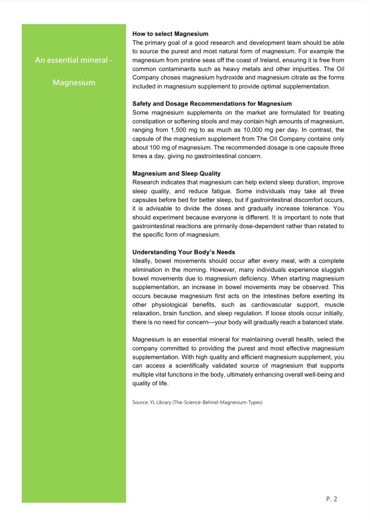 The primary goal of a good research and development team should be able to source the purest and most natural form of magnesium. For example the magnesium from pristine seas off the coast of Ireland, ensuring it is free from common contaminants such as heavy metals and other impurities. The Oil Company choses magnesium hydroxide and magnesium citrate as the forms included in magnesium supplement to provide optimal supplementation.
