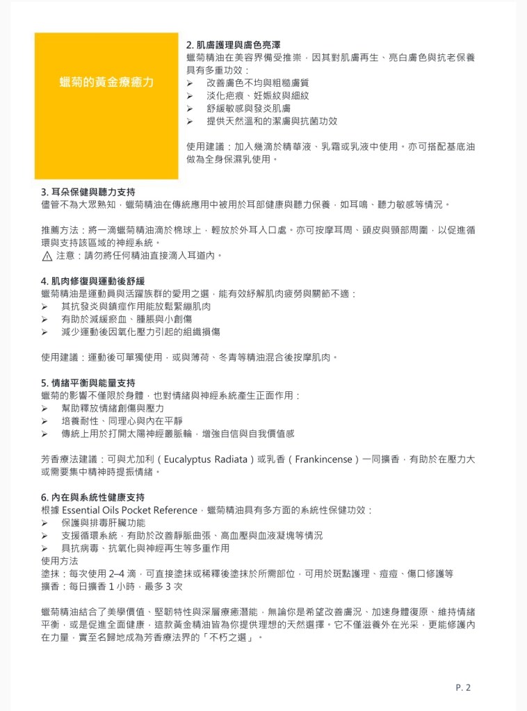 氣味方面,蠟菊精油帶有甜美草本與蜂蜜般的香氣底蘊,適合應用於芳療與日常保養,為身心帶來穩定與平衡。蠟菊精油的主要功效