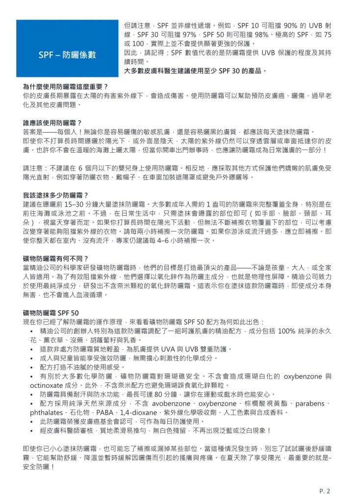 • 精油公司的創辦人特別為這款防曬霜調配了一組呵護肌膚的精油配方,成分包括 100% 純淨的永久花、薰衣草、沒藥、胡蘿蔔籽與乳香。