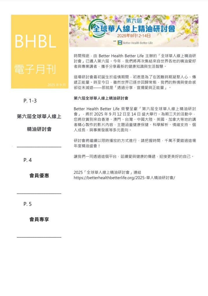 Better Health Better Life 呈獻「第六屆全球華人線上精油研討會」,將於 2025年9月12日至14日 盛大舉行。為期三天的活動中,您將欣賞到來自香港、澳門、台灣、中國大陸、英國、加拿大、新加坡等地的講者精心製作的影片內容,主題涵蓋健康保健、科學解析、情緒支持、個人成長、與事業發展等多元面向。