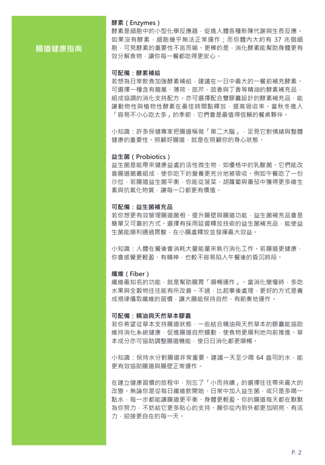 若想為日常飲食加強酵素補給,建議在一日中最大的一餐前補充酵素。可選擇一種含有龍蒿、薄荷、茴芹、茴香與丁香等精油的酵素補充品,組成協調的消化支持配方。亦可選擇配合雙膠囊設計的酵素補充品,能讓動物性與植物性酵素在最佳時間點釋放,提高吸收率。當秋冬進入「容易不小心吃太多」的季節,它們會是最值得信賴的餐桌夥伴。