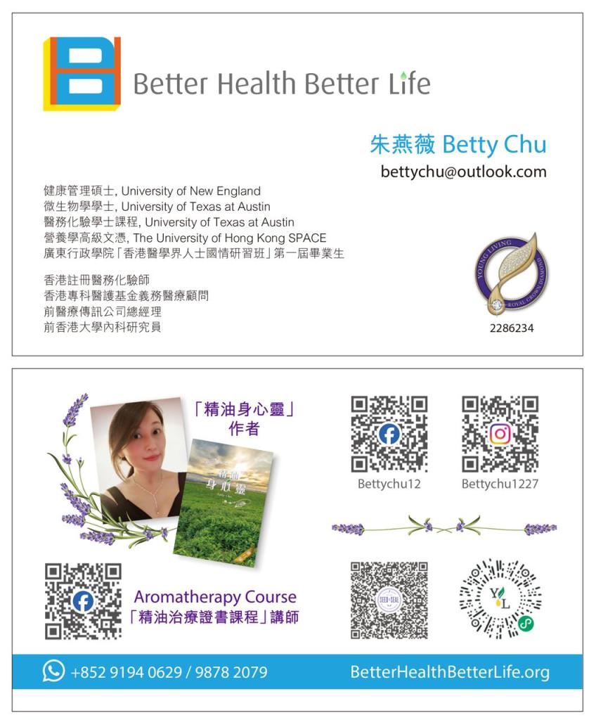 I hold a Bachelor’s degree in Microbiology and a Master’s degree in Health Management. I previously served as COO of Healthcare Operations; I am also the exclusive distributor of Better Chinese Hong Kong (Asia). Years ago upon purchase of 11 top-graded essential oils, I have also established the first French Aromatherapy course and ran an essential oil business in Hong Kong/Macau.